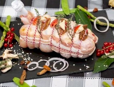 Chapon de pintade désossé, farce fine de volaille, chataignes, foie gras, Armagnac